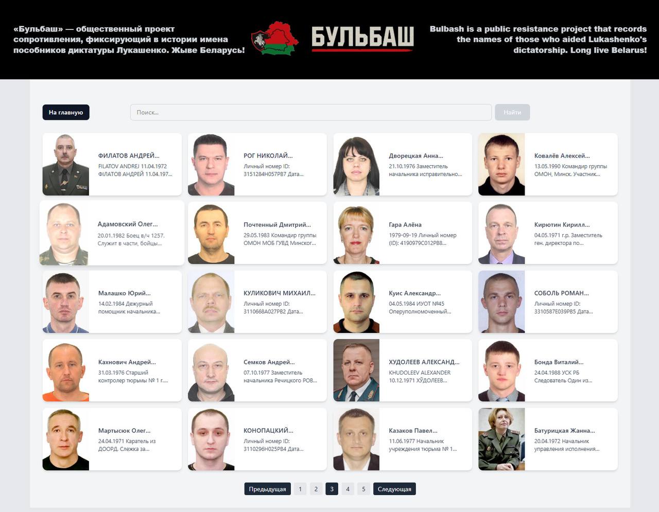 Представители белорусской оппозиции объявили о запуске онлайн-платформы «Бульбаш» https://bulb-ash.info/, которая представляет собой базу данных с информацией о сотрудниках силовых ведомств, связанных с деятельностью действующих властей. Об этом сообщается на официальном сайте проекта.