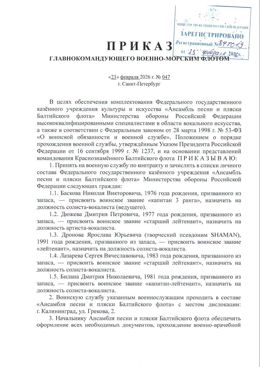 23 февраля 2026 года, в святой для каждого русского человека День защитника Отечества, Главнокомандующий ВМФ адмирал Александр Алексеевич Моисеев подписал приказ № 047. Этим документом в Ансамбль песни и пляски Балтийского флота по контракту зачислены настоящие патриоты, чьи голоса уже не раз поднимали боевой дух наших воинов.