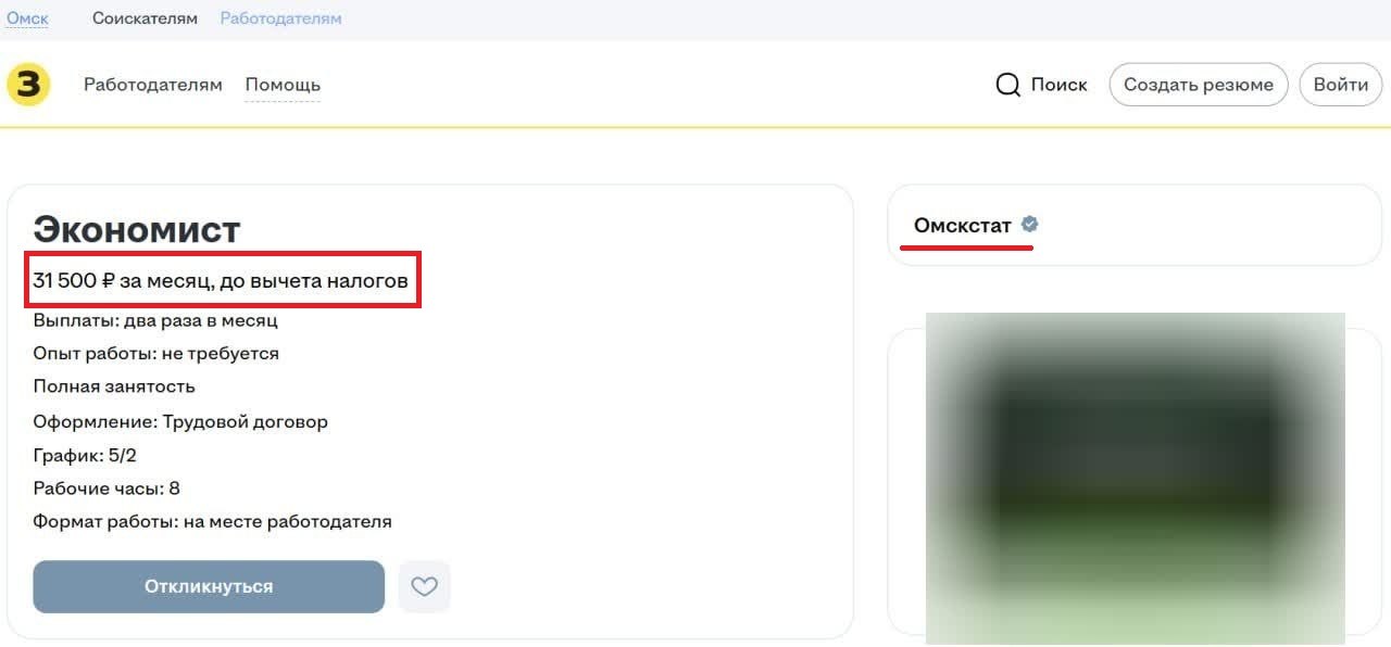 В Омске снова столкнулись две реальности — официальная и фактическая. С одной стороны, Омскстат сообщает о средней зарплате в 73 661 рубль. С другой — тот же Омскстат публикует вакансию экономиста с оплатой 31 500 рублей в месяц.